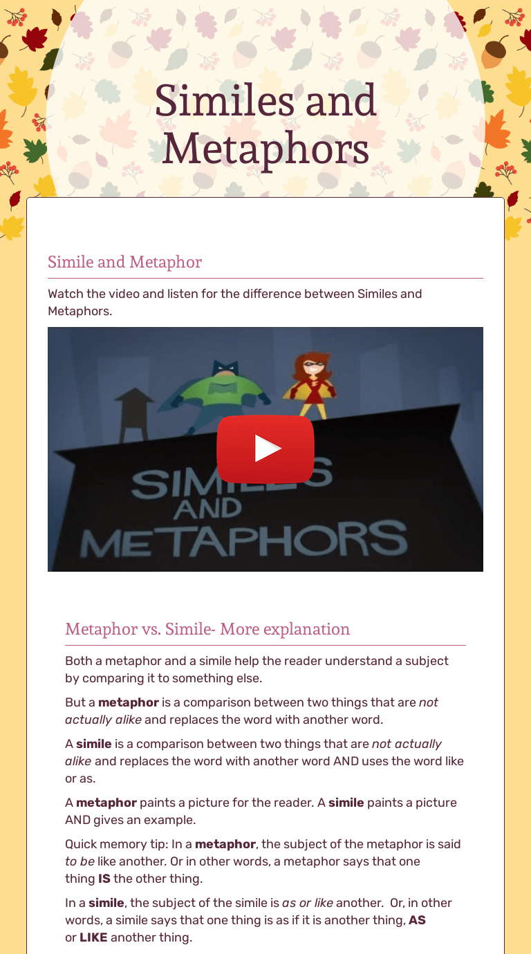 Monday Freebie Simile Worksheet Key For Middle Grades By Lovin Lit from ecdn.teacherspayteachers.com Similes are a lot of fun to write! 19.12.2020 · synonyms and antonyms third and fourth grades worksheet synonyms and antonyms primary elementary grades worksheet synonyms and antonyms 5th and 6th grades worksheet synonyms and antonyms 7th and 8th grades worksheet synonyms and antonyms 9th 12th grades worksheet helping verb worksheets contractions worksheets advice vs. 28.08.2021 · 9th grade dramatic literature: Click on the image to display our poetry worksheets. Print out this free worksheet and see what your students come up with! So, the fun part of this unit is the ever evolving short stories we can use to teach the basics of short stories and literary elements of plot, characterization, setting, figurative language, etc. They still had a touch of that helpfulness that elementary students have. Simile, metaphor, hyperbole, personification, alliteration, onomatopoeia, idiom, and allusion.these activities are perfect for weekly homework, daily/bell work, classwork, …